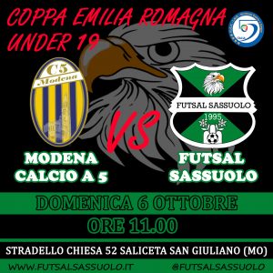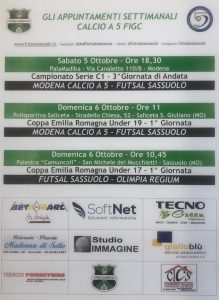 Doppio incontro con il Modena Calcio a 5 per il Futsal Sassuolo! Entrambi gli scontri saranno in trasferta. Il primo vede la prima squadra impegnato al PalaMadiba di Modena alle ore 18.30 nella giornata di Sabato 5 Ottobre per il match valido per la 3° giornata di campionato di serie C1. Il secondo incontro contro i gialloblu vede l’Under 19 di mister Poggi iniziare il proprio cammino nella Coppa Emilia Romagna della categoria. Gara in programma Domenica 6 Ottobre alle ore 11 presso il centro sportivo di Saliceta San Giuliano (MO).