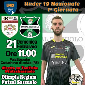 Domenica 21 febbraio inizia il campionato Under 19 nazionale. Il Futsal Sassuolo sarà ospite dell’Olimpia Regium al PalaSocrate in quel di Castelnovo di Sotto (RE). La partita sarà a porte chiuse ma verrà trasmessa in diretta sul nostro profilo Youtube.