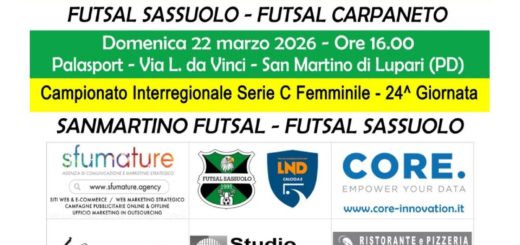 Dopo un’attesa di un’ora e mezza a causa di mancanza del direttore di gara dovuta ad un errore di comunicazione tra FIGC e AIA, si è svolta la penultima giornata del campionato femminile FIGC Serie C tra Futsal Sassuolo e CUS Padova. Le venete hanno avuto la meglio sulle neroverdi consolidando il vantaggio già nel primo tempo, prima si sono portate sullo 0-3 poi Vandelli ha accorciato le distanze, ma il risultato a metà tempo è arrivato sull’1-5. Nel secondo tempo Giombetti segna un’altra rete per il Sassuolo ma le ospiti rendono più rotondo il punteggio finale fino al 2-9.