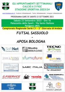 Sabato 23 settembre il Futsal Sassuolo esordirà in casa nel nuovo campionato di Serie C1. L’avversario sarà l’Aposa Bologna che sarà ospitata tra le mura amiche del Palazzetto dello Sport di Palagano (MO) con calcio d’inizio alle ore 16.00