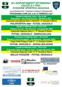 Il prossimo weekend inizia sabato con la prima squadra femminile che è impegnata sul campo della capolista Polisportiva 1980. Il calcio d’inizio è alle ore 15,00 presso il Palazzetto di Bertinoro (FC).