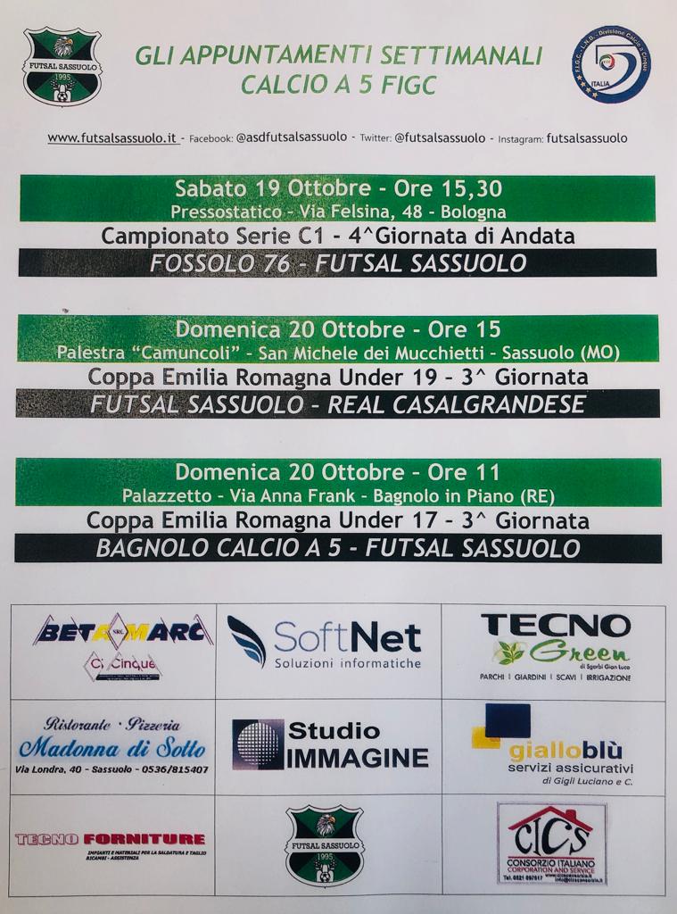 Gli appuntamenti del weekend 19/20 di ottobre! Si comincia Sabato 19 Ottobre alle ore 15.30 con la Serie C1 impegnata con la difficile trasferta a Bologna contro il Fossolo 76. La squadra bolognese si trova a quota...
